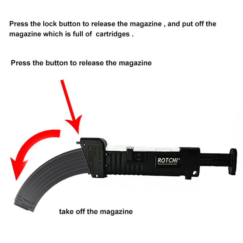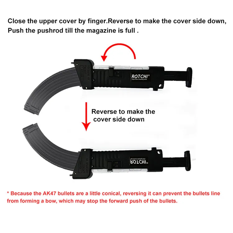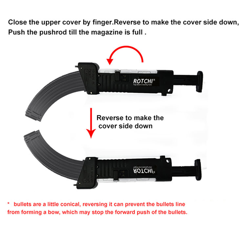 Zásobník Speed Loader pro AK47 ● Používá se k vkládání nábojů 7,62X39mm do zásobníku AK o kapacitě 10/20/30 nebo větší. ● Náboje naplňte do drážky, zásobník nainstalujte na stejném mechanickém principu jako AK. zatlačte na tlačník, náboje se snadno dostanou do zásobníku. ● Snadné ovládání, dívka může dělat velmi rychle. ● Silné tělo. Náboje uvnitř nakladače můžete vidět skrz zasněný kryt. Zámek kontroluje, aby se kryt během skladování neotevíral. ● Může také vyjmout náboje ze zásobníku, když nebudete střílet, ale zásobník je stále plný.